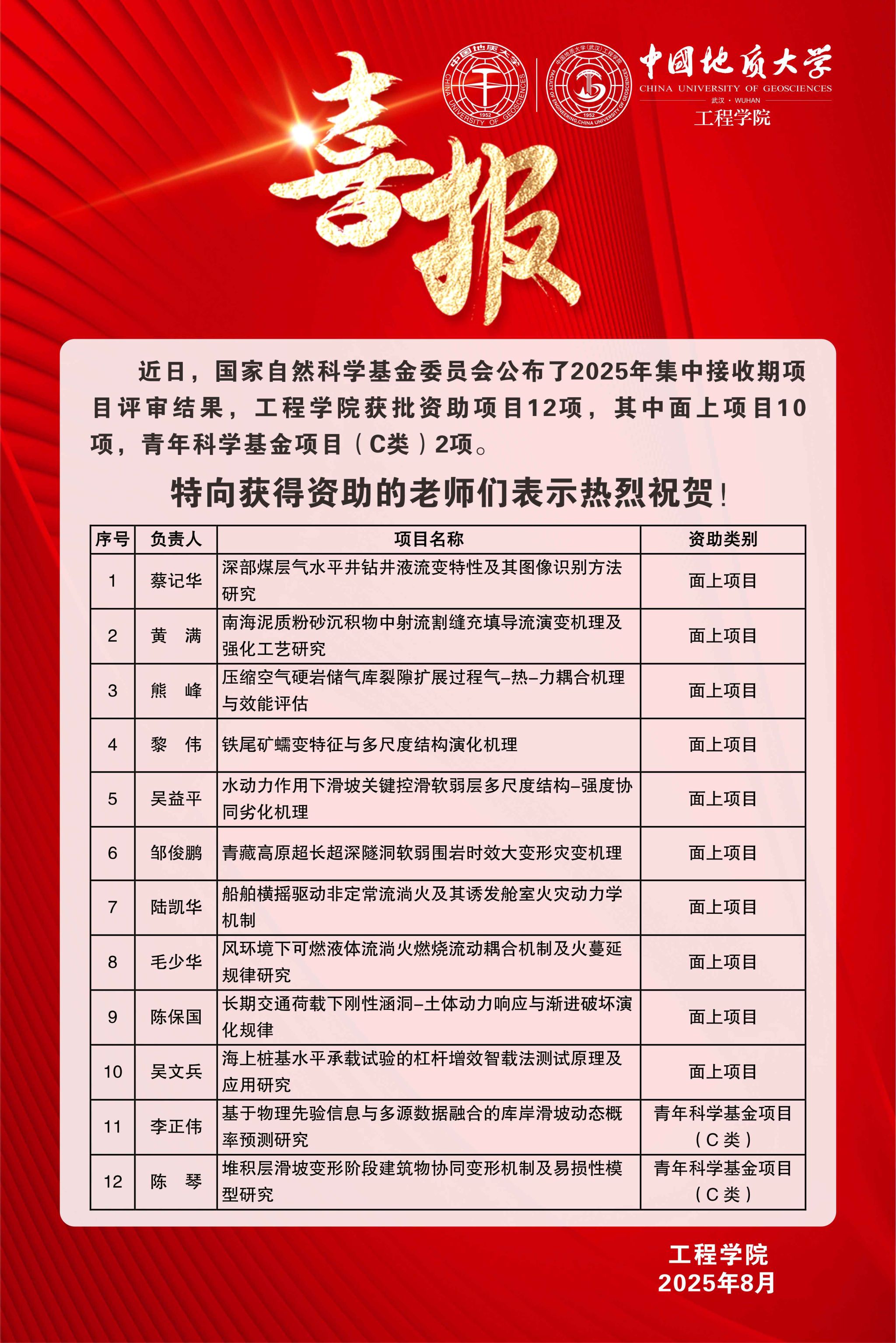 喜报:工程学院获批国家自然科学基金项目12项